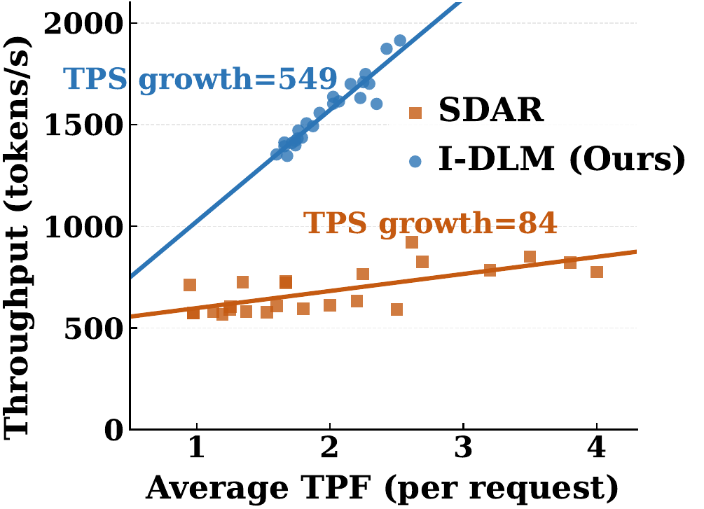 - I-DLM (N=4, p=0.9): TPF ≈ 2.9, processes 2N−1=7 queries/forward → compute efficiency = 2.9²/7 ≈ 1.22. Each FLOP produces more useful output than AR — I-DLM stays in the memory-bound regime at concurrency levels where SDAR is already saturated (batching efficiency slope = 549).