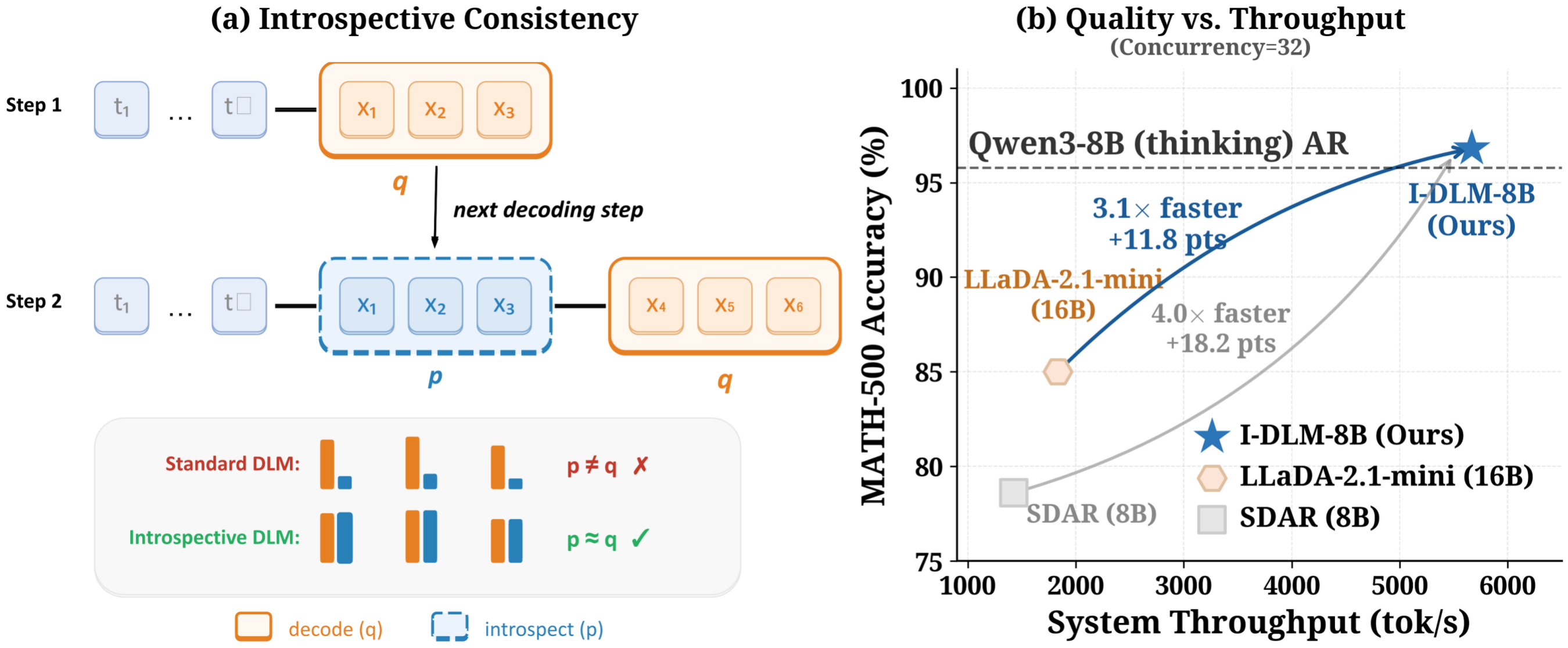 Empirically, I-DLM-8B is the first DLM to match the quality of its same-scale AR counterpart, outperforming LLaDA-2.1-mini (16B) by +26 on AIME-24 and +15 on LiveCodeBench-v6 with half the parameters, while delivering 2.9-4.1x throughput at high concurrency. With gated LoRA, ISD enables bit-for-bit lossless acceleration.
