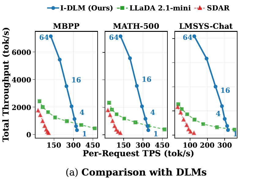 Efficiency > 1 means parallel decoding actually saves total compute vs. AR. This is why I-DLM's throughput scales with concurrency while SDAR and LLaDA plateau in the throughput figure above.